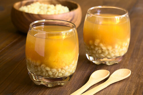 Mote con huesillo is a syrupy drink made from peach juice, honey and husked wheat or other grains and seeds.
