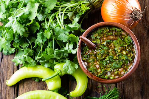 Pebre is a very spicy sauce. This pebre sauce is made of tomatoes, onions, garlic, olive oil herbs and peppers and lots of cilantro (coriander).