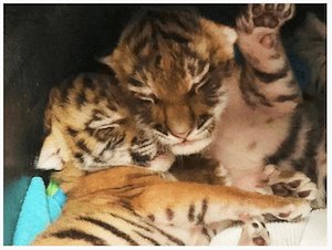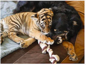 © dpaThis tiger cub and the big black dog are good friends. The cub and his two siblings play with the dog Blakely regularly. The tiger cubs were born in a zoo in Cincinnati in the United States of America in February. However, their mother did not care for the cubs after they were born. So the zookeepers fed them every day. Still, the zookeepers say they cannot teach the tiger cubs everything an animal needs to know. This is what Blakely does.