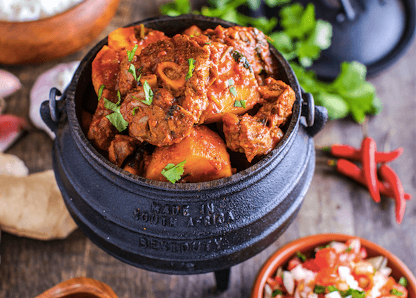 Potjiekos is a meat stew cooked for several hours over open fire with a variety of vegetables and usually includes also mielies, corn. This traditional stew is cooked in a potjie, which is usually a black cast-iron pot with three legs.